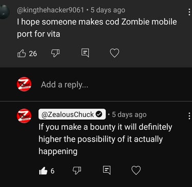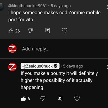 Take Call of Duty Black Ops Zombies as an example. Lot of people want to see the PS Vita port. This recent comment even received 26 likes under my post and do you know what ? There is still no bounty for it = 0% chance it is coming. Why? Because the devs just doesn't like this game